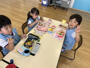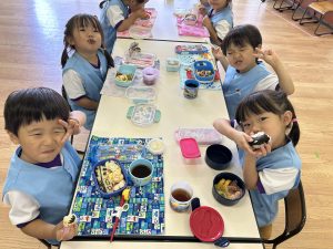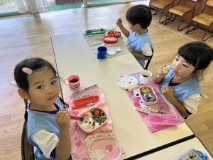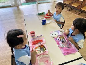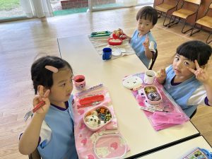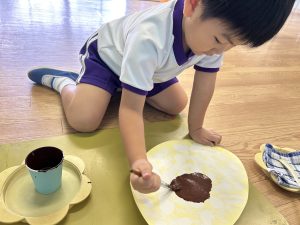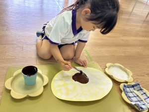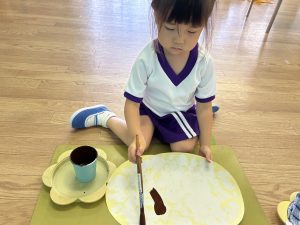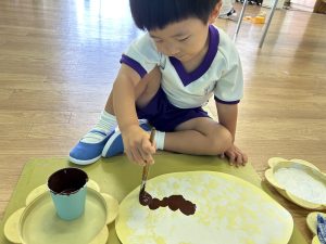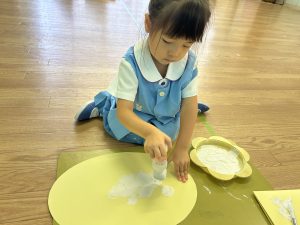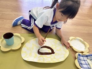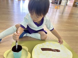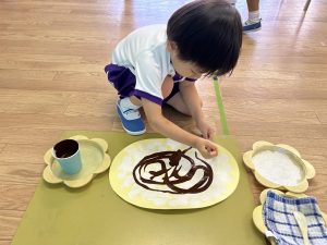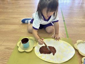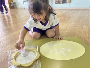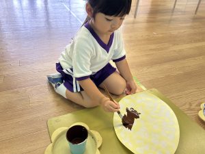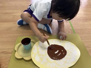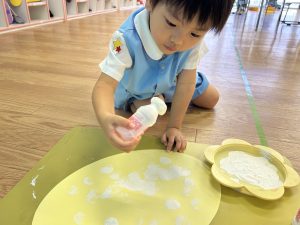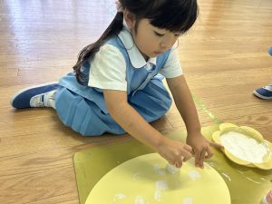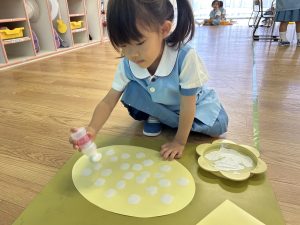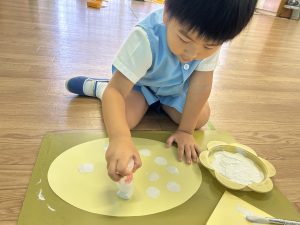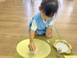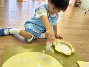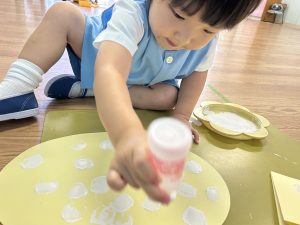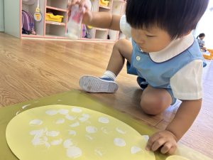 2学期から、製作の内容が少し難しくなったり、ハサミを使う機会が増えたりなど、できることが増えてきている子どもたちです。 絵の具やハサミなどの道具を使うときは、使い方やお約束を伝えながら進めています😊