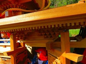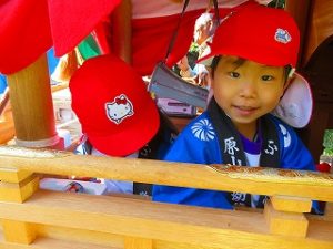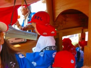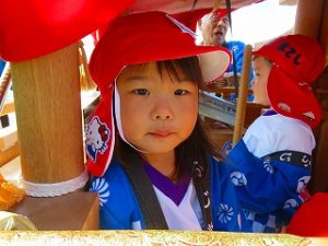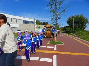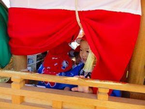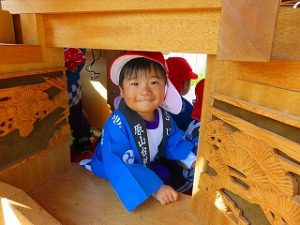 最年少児「ばらぐみさん」はだんじりに乗り、太鼓を叩いていました。