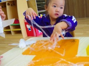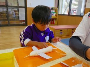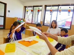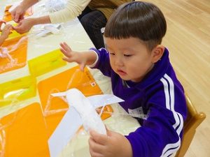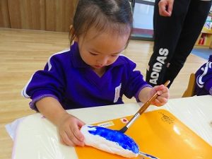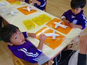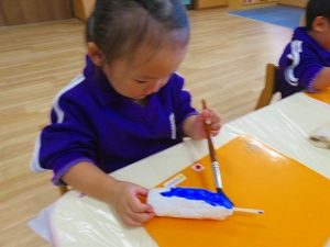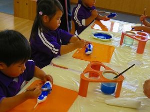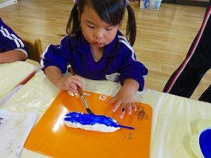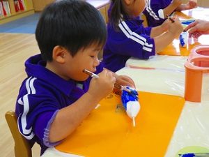 紙粘土の形を整えて、翼を付け、絵の具を塗り・・・・・・