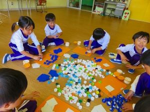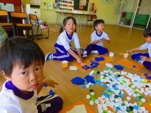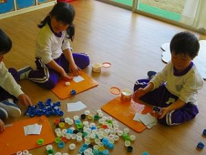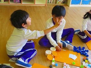 ペットボトルのキャップに折り紙をまいて・・・・・・