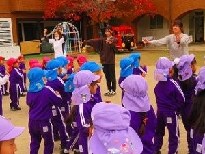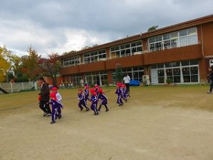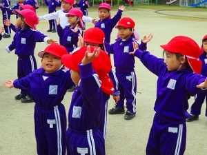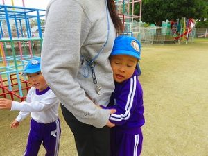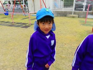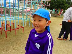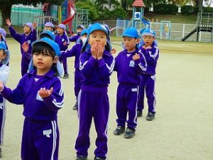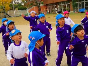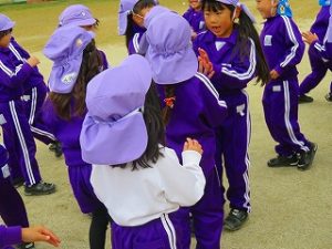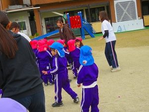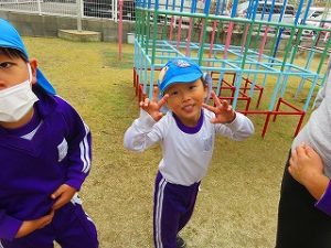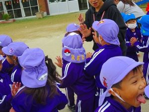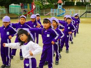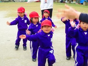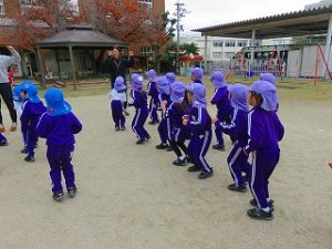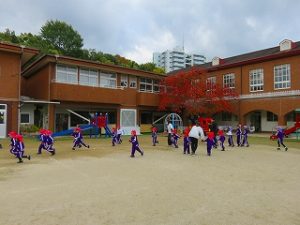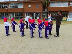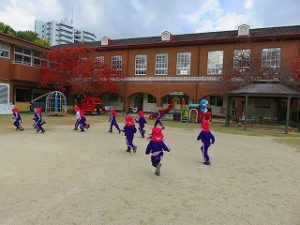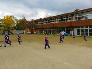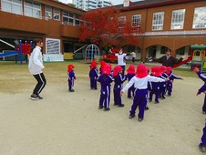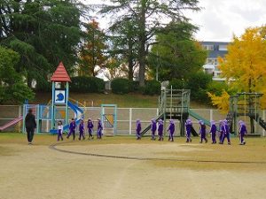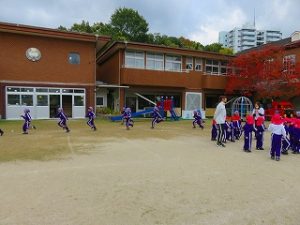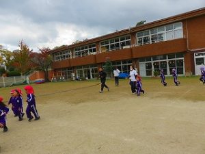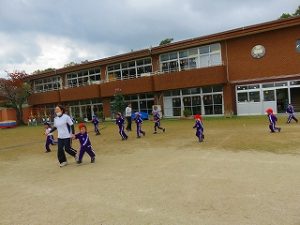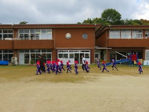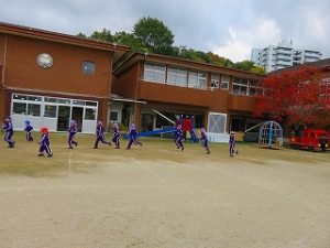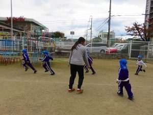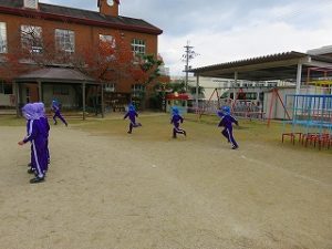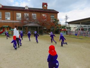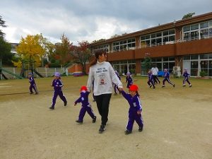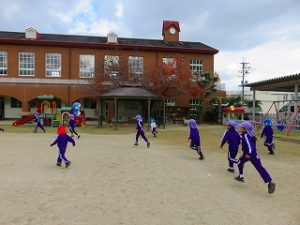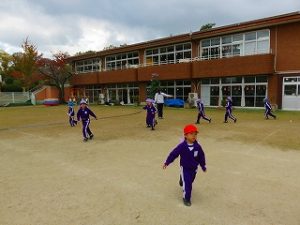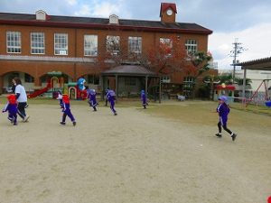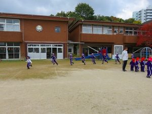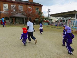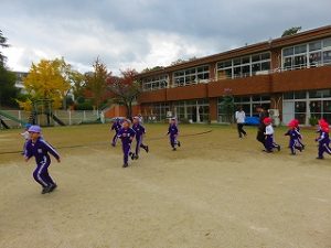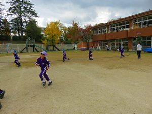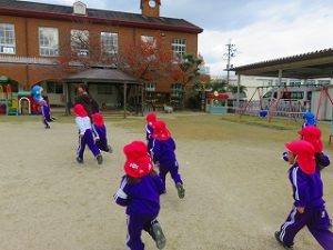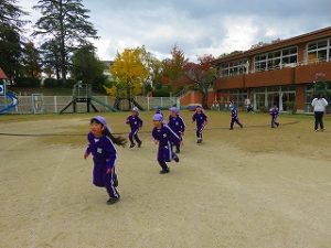 朝の体操後、園庭内をマラソンしています