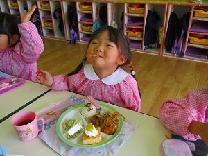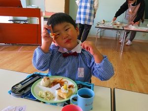 園で採れた「栗」をトッピングしたケーキもあり、食欲モリモリの子ども達です。