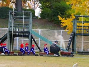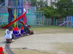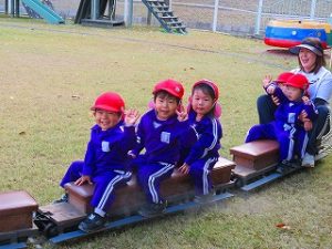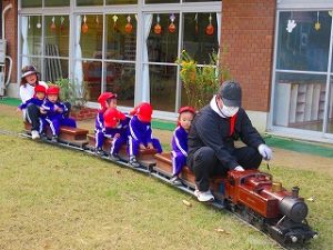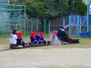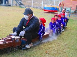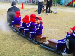 蒸気機関車特有の石炭を燃やす香りと共に「ポッポー」の汽笛を聞きながら、全園児楽しく乗りました。