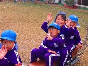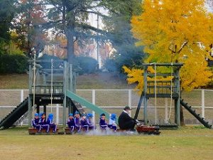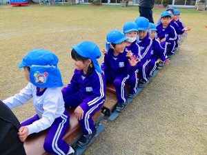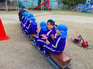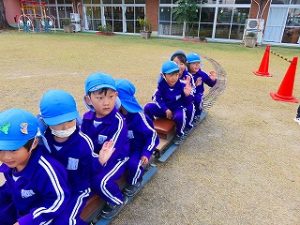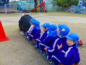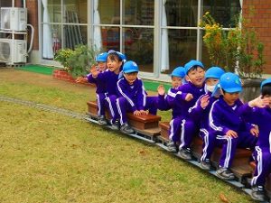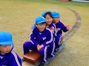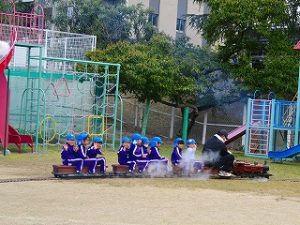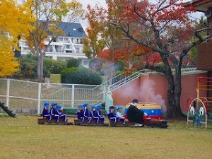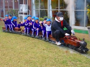 蒸気機関車特有の石炭を燃やす香りと共に「ポッポー」の汽笛を聞きながら、全園児楽しく乗りました。