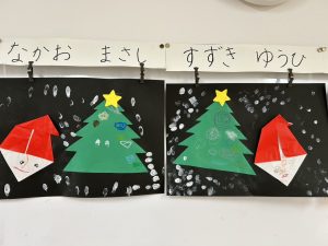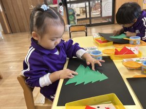 クリスマスツリーの端っこだけに糊を付けるのですが…みんなちょっとずつちょっとずつ糊を付けて頑張っていましたよ✨