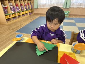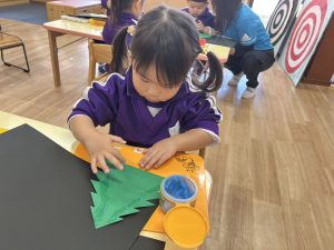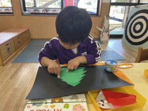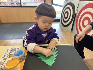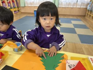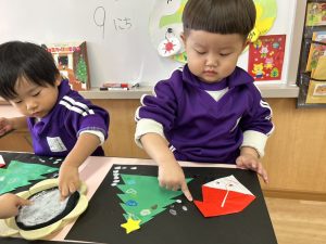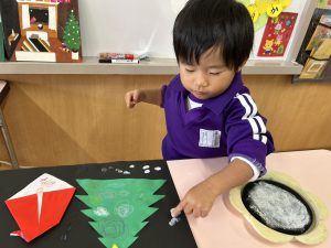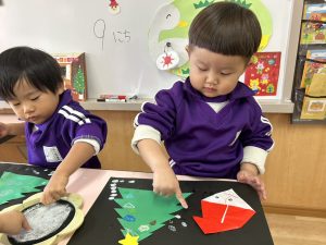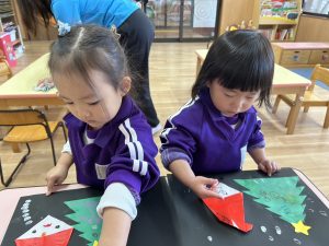 クリスマスツリーの端っこだけに糊を付けるのですが…みんなちょっとずつちょっとずつ糊を付けて頑張っていましたよ✨