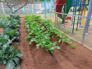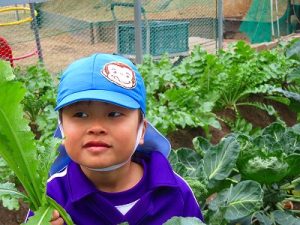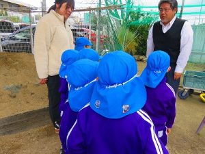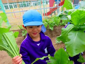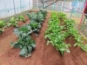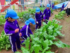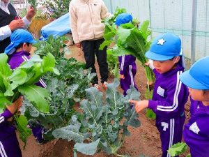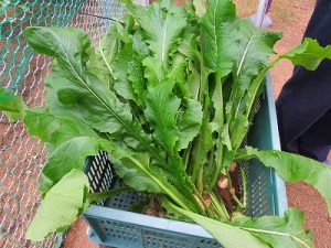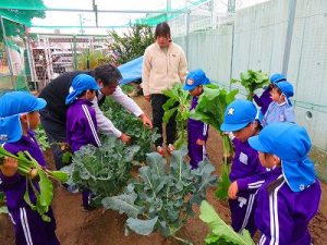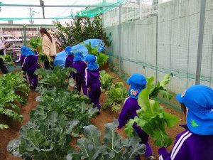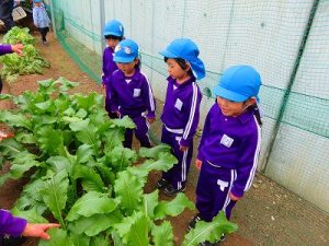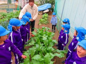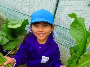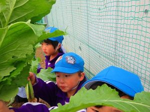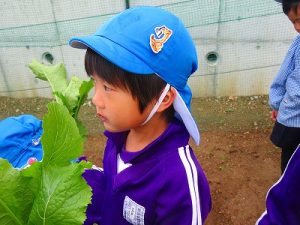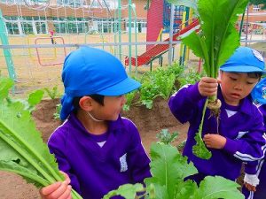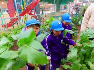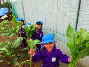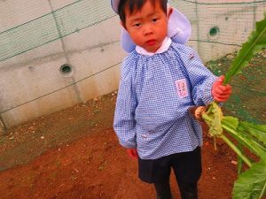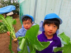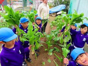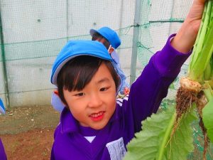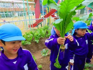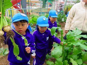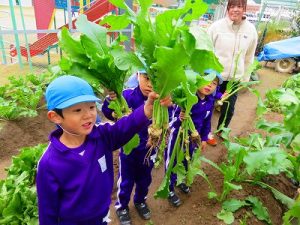 園の農園の蕪の収穫時期が来たので、種を植えたすみれぐみさんが収穫をしました。