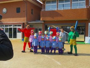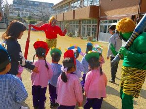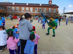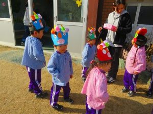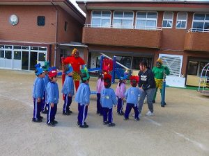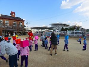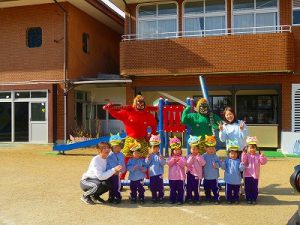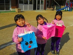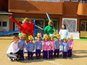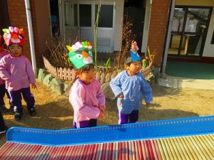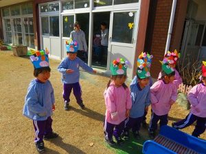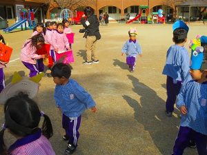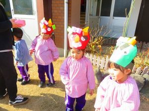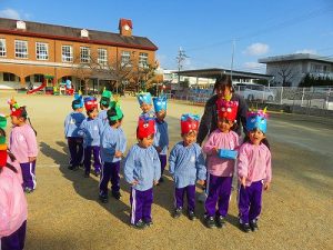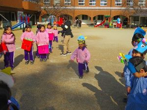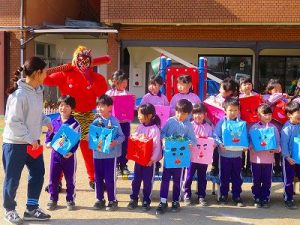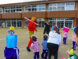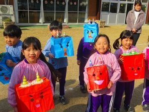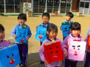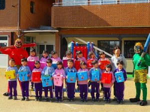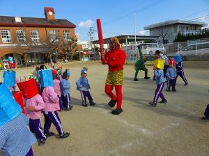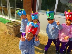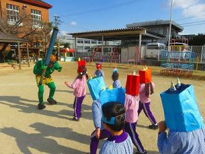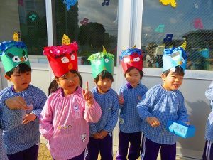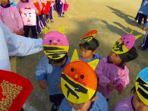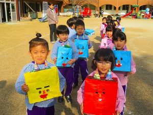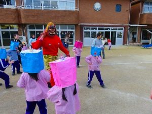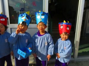 節分にちなんで、子ども達は鬼のお面を作りました。いろんな表情の鬼さん達です。そして今日は幼稚園にも鬼がやってきましたよ。怖そうな赤鬼と緑鬼の登場に子ども達の歓声と、怖い~という声も響いた園庭でした。涙目になりながらも豆を頑張って投げる子もいましたよ。「鬼は~外・福は~内!」今年も健康に春を迎え、過ごしていきましょう。2026.2.2