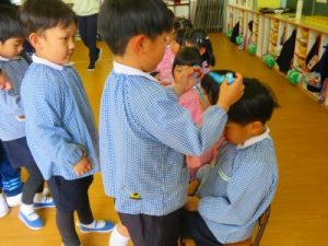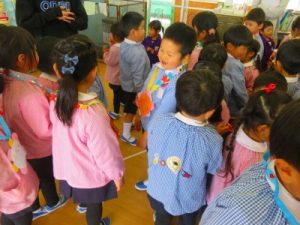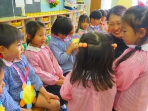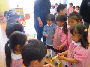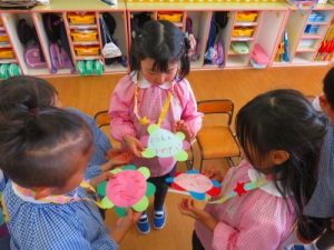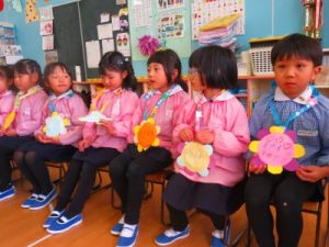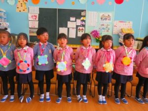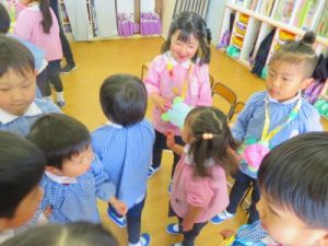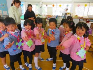 在園児みんなで作った「ペンダント」と「みんな友だち」のお歌をプレゼントしました。