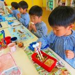 今日は大好きなお弁当日 食欲旺盛な年中・長児さんはお口いっぱいに頬張り美味しそうに食べていました。 楽しそうなランチタイムです すみれぐみ ふじぐみ ふ