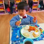 開園記念日の今日は、給食も「お祝いランチ」 子ども達の好きな物ばかりで、大満足!! 園で採れた「栗」をトッピングしたケーキもあり、食欲モリモリの子ども達です。