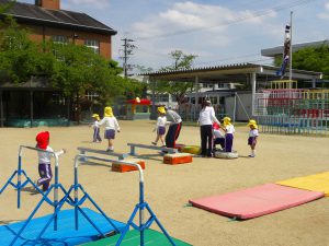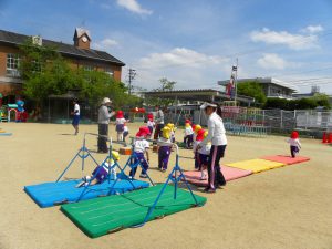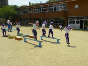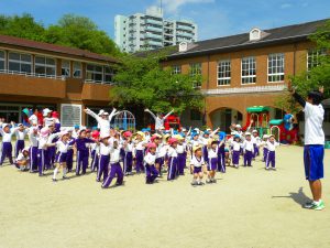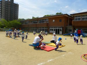 楽しい雰囲気の中、体いっぱい動かして体育指導を楽しみました。