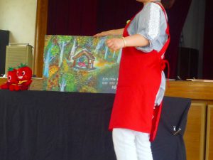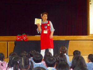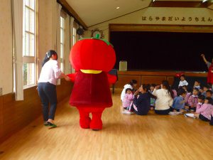 大型絵本もあり、手遊びなどの楽しい時間を過ごしていると、可愛い真っ赤な「トマトちゃん」登場