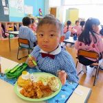 開園記念日の今日は、給食も「お祝いランチ」 子ども達の好きな物ばかりです。 園で採れた「栗」をトッピングしたケーキもあり、食欲モリモリの子ども達でした